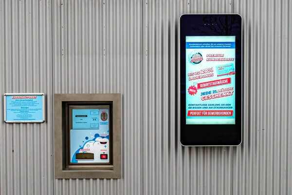 Die Wash Buddies GmbH & Co. KG aus Fürth hat ihre SB-Waschanlage modernisiert und mit neuer Technik ausgestattet. Für die Kundenansprache, den Informationsaustausch und die Angebotspräsentation wurden zwei freistehende Stehen mit jeweils einem 55 Zoll Display im Einfahrtsbereich der Waschanlage installiert. Zudem ist noch ein mobiler und wasserfester Kundenstopper als mobiles Display direkt an der Waschanlage im Einsatz.