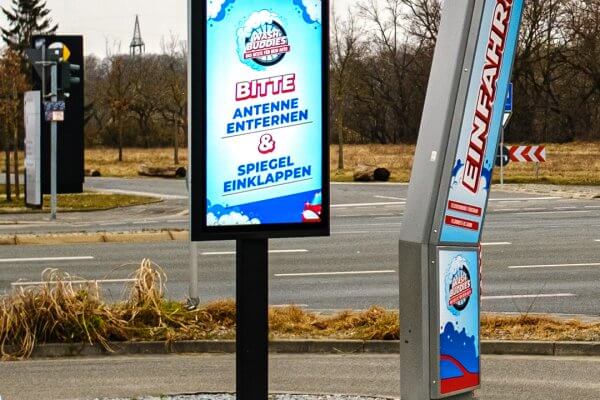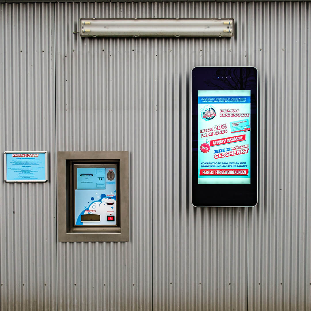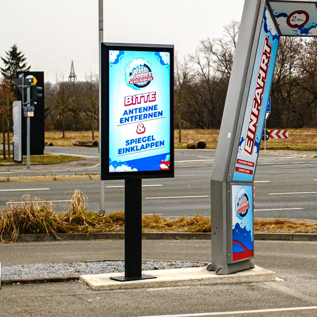 Die Wash Buddies GmbH & Co. KG aus Fürth hat ihre SB-Waschanlage modernisiert und mit neuer Technik ausgestattet. Für die Kundenansprache, den Informationsaustausch und die Angebotspräsentation wurden zwei freistehende Stehen mit jeweils einem 55 Zoll Display im Einfahrtsbereich der Waschanlage installiert. Zudem ist noch ein mobiler und wasserfester Kundenstopper als mobiles Display direkt an der Waschanlage im Einsatz.