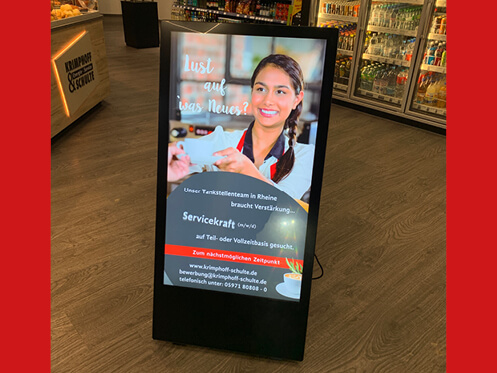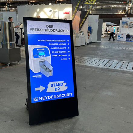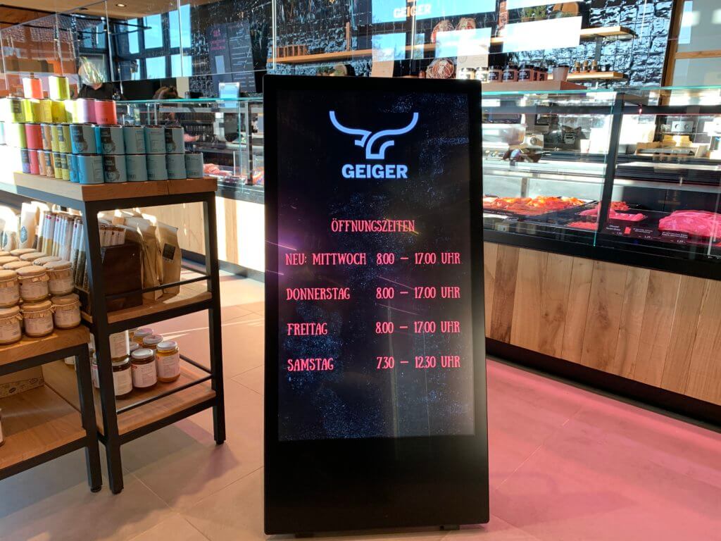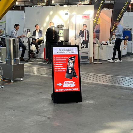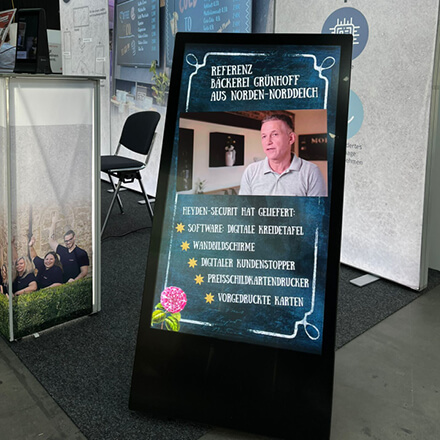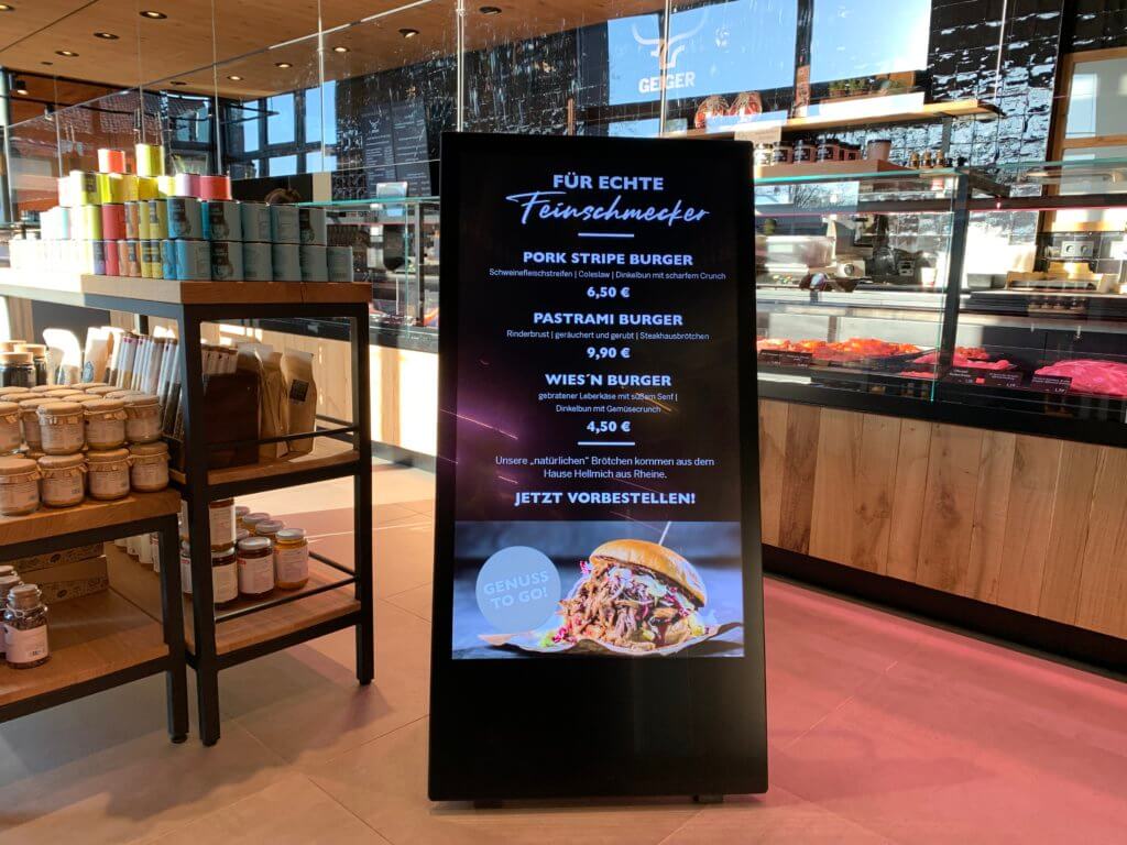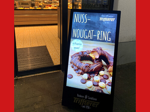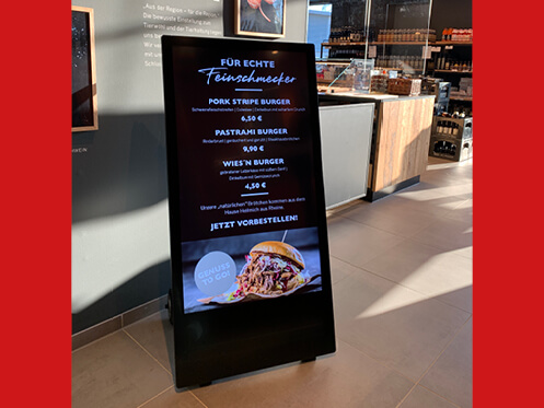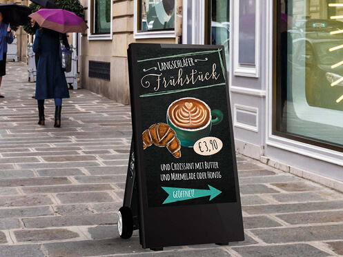 Mit dem digitalen Kundenstopper informieren Sie stets aktuell. In Laufzonen vor und in Geschäften lenkt er als imageträchtiger und innovativer Botschafter effektiv die Kundenbewegungen. Nutzen Sie dabei die Möglichkeiten der Digital Signage Software Wesual Create und zeigen Sie vor- und nachmittags die jeweils passenden Angebote. So verstärken Sie z.B. einen kurzfristigen Abverkauf mit nur wenigen Klicks. Die Erfahrungen belegen nachhaltigen Erfolg u.a. in Restaurants, Bäckereien, Cafés, Fleischereien sowie vielen weiteren Bereichen des Einzelhandels.
