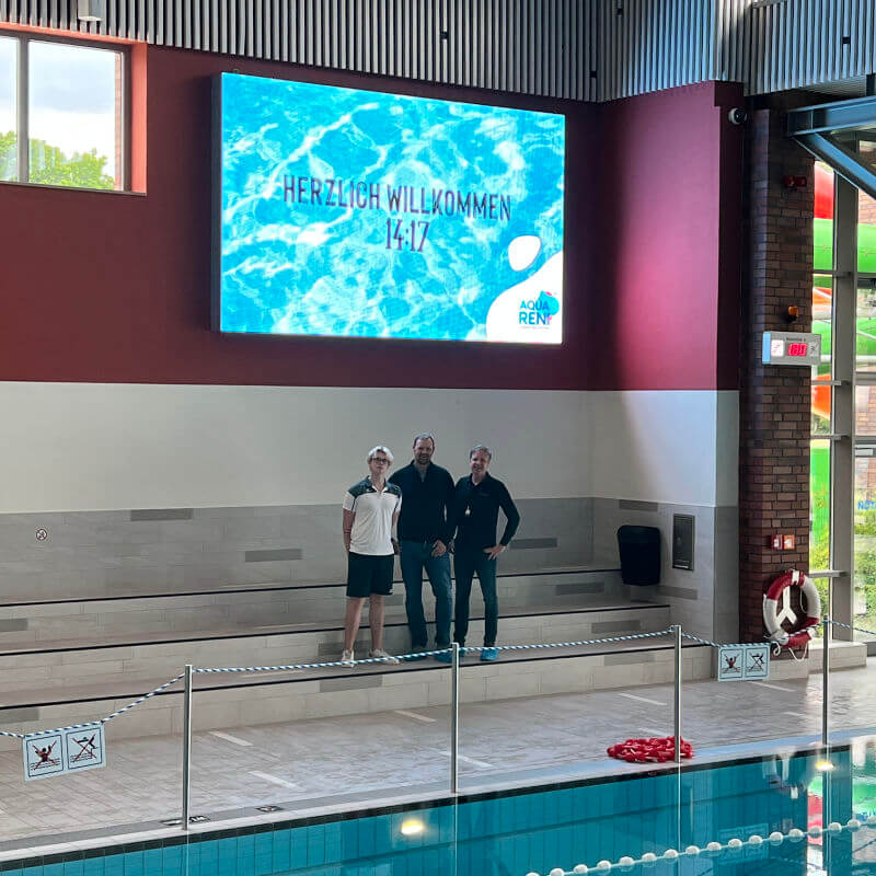 Dieses „Heimprojekt“ macht uns besonders stolz, denn zum einen zeigt sich, dass unser Digitales Plakat auch eine tolle Lösung für Städte, Kommunen und Bäder ist und wir zudem durch neue Partnerschaften, wie hier mit LEDCON, auch besondere Anforderungen umsetzen können.