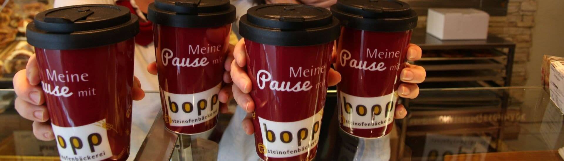 Coffee2Go-Becher mit dem Logo der Steinofenbäckerei Bopp