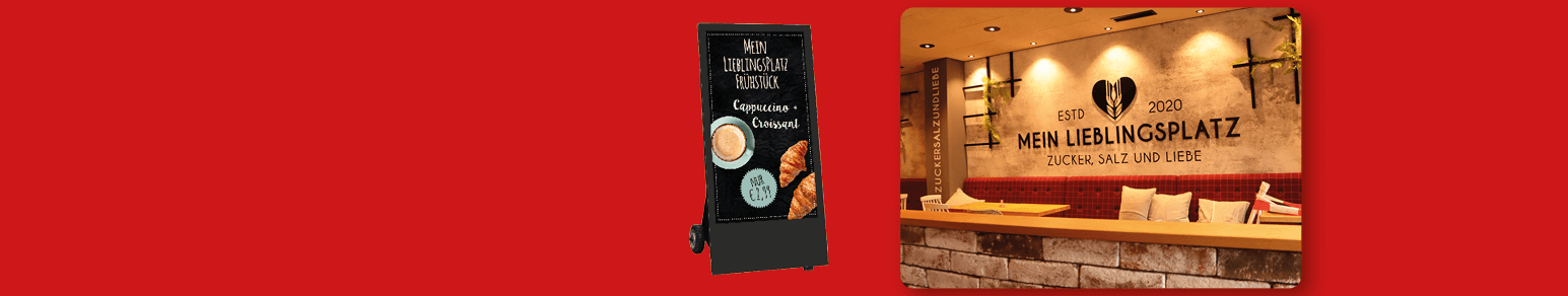 Holm Fröchtenicht aus Northeim eröffnete im März 2020 sein neues Café "Mein Lieblingsplatz" direkt am Marktplatz in Northeim. Eine tolle Lage, ein tolles Konzept, ein tolles Team. Aber dann kam Corona. Natürlich war das wirtschaftlich gesehen nicht so vorgesehen - doch der gelernte Bäcker nahm die Krise ernst und nutze diese, um das Café und das Team kennenzulernen und konzentrierte sich mit aller Kraft auf das schick eingerichtete Café. Social Media nutzte er in vollem Umfang - um im Gespräch zu bleiben. Und hier kommt die digitale Kreidetafel von wesual ins Spiel. Denn mit den vielen stylischen Vorlagen und unendlich vielen Möglichkeiten lassen sich die Bilder nicht nur vor Ort, sondern auch im Netz verwenden. Mit Erfolg. Denn als die Regeln wieder gelockert wurden und die Northeimer wieder am Markt nutzen durften, kamen Sie auch ins Café. Seit neuestem steht auch vor dem Café der digitale Kundenstopper - natürlich kombiniert mit der Digitalen Kreidetafel. Perfekte Reklame für Laufkundschaft - denn Angebote können hier gezielt abgespielt werden. Der batteriebetriebene (12 Stunden Akku) ist für Drinnen und Draußen geeignet - dank Schutzklasse IP65.